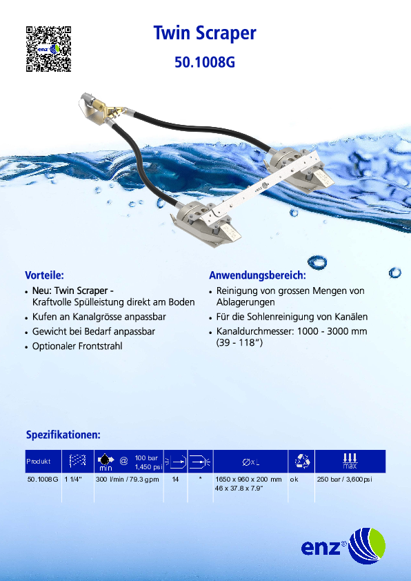 Eine besondere Stärke liegt in der enz Kreuzstrahltechnologie, die beim Beseitigen von Verstopfungen hervorragende Ergebnisse ermöglicht. Mit den austauschbaren enz Saphireinsätzen wird Pumpenleistung in Wasserstrahlen mit einer grösseren Wasserdichte (ideal zum Penetrieren von Beschichtungen) umgewandelt. Die enz Wasserbremse regelt die Drehung der Düse und garantiert eine maximale Aufprallkraft und optimale Reinigung.