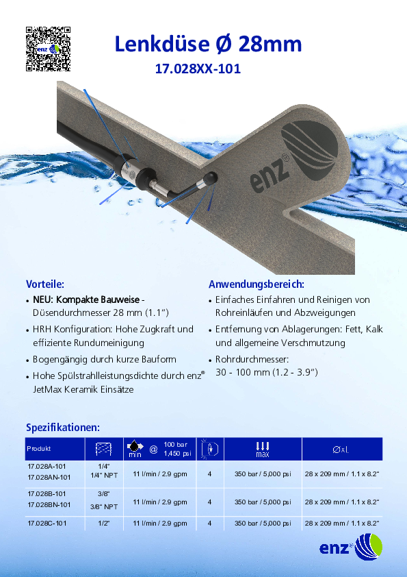 Die neue enz® Lenkdüse Ø 28 mm überzeugt mit kompakter Bauweise, hoher Spülstrahlleistung und optimaler Bogengängigkeit. Dank JetMax-Keramikeinsätzen sorgt sie für effiziente Reinigung selbst bei Fett-, Kalk- und Schmutzablagerungen in Rohrdurchmessern von 30 bis 100 mm. Ideal für den flexiblen Einsatz in Rohrleitungen und Abzweigungen. Hier geht's weiter…