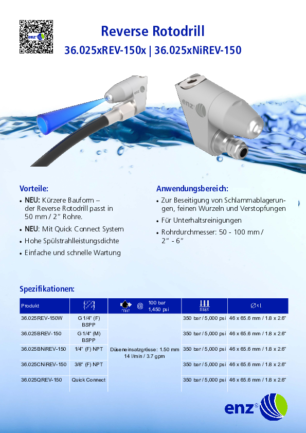 Der neue enz® Reverse Rotodrill überzeugt mit kürzerer Bauform und passt bereits in 50 mm / 2" Rohre. Mit Quick Connect System, hoher Spülstrahlleistung und einfacher Wartung eignet er sich perfekt zur Beseitigung von Schlamm, Wurzeln und Verstopfungen sowie für Unterhaltsreinigungen.