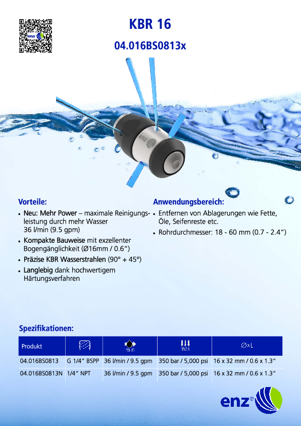 Die neue KBR 16 (04.016BS0813) liefert mehr Power mit einem erhöhten Wasserdurchfluss von 36 l/min (9.5 gpm) und sorgt so für maximale Reinigungsleistung. Ihre kompakte Bauweise mit hervorragender Bogengängigkeit (Ø16 mm/0.6") macht sie besonders vielseitig einsetzbar. Präzise KBR-Wasserstrahlen (90° und 45°) sowie ein hochwertiges Härtungsverfahren gewährleisten zudem Langlebigkeit und Effizienz.