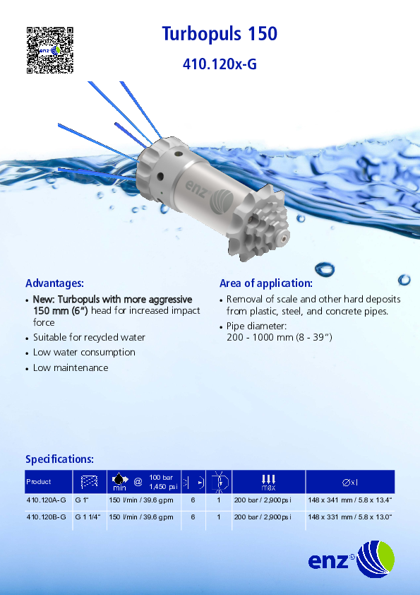 We are expanding our product range with the Turbopuls 150 (410.120x-G) – featuring a more aggressive 150 mm (6") head for increased impact force. Designed for efficiency with low water consumption, suitability for recycled water, and minimal maintenance. Perfect for removing scale and other hard deposits from plastic, steel, and concrete pipes with diameters from 200 to 1000 mm (8 - 39").